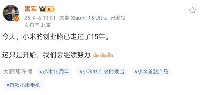 4月6日,雷军微博停更5天后首次发声:“今天,小米创业路已走过15年,这只是开始,我们会继续努力”。除了雷军外,小米多名高管也就小米15周年发声。小米联合创始人、副董事长林斌转发雷军微博并表示:“感谢大家15年的支持!”小米总裁卢伟冰表示:......